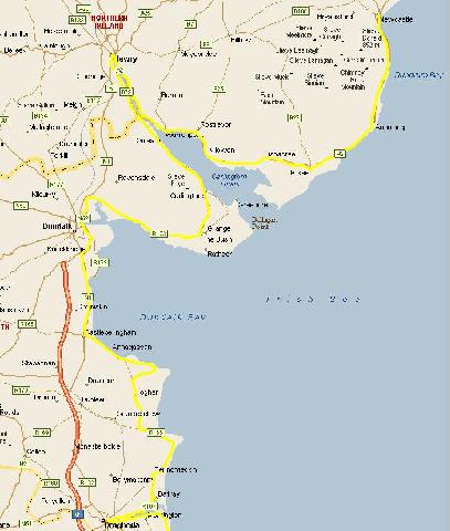 From Newry it got a lot harder. First of all the terrain was known to me so I knew what was ahead. The ride from Newry to Dublin is pretty dull with long stretches of "coast" road following the coast about 3 miles inland. Also the wind picked up and the as long as I was heading east progress was slow. However I reached Newry at 1300 an hour earlier than I thought and I was in Carlingford for 1400 so things were looking good.